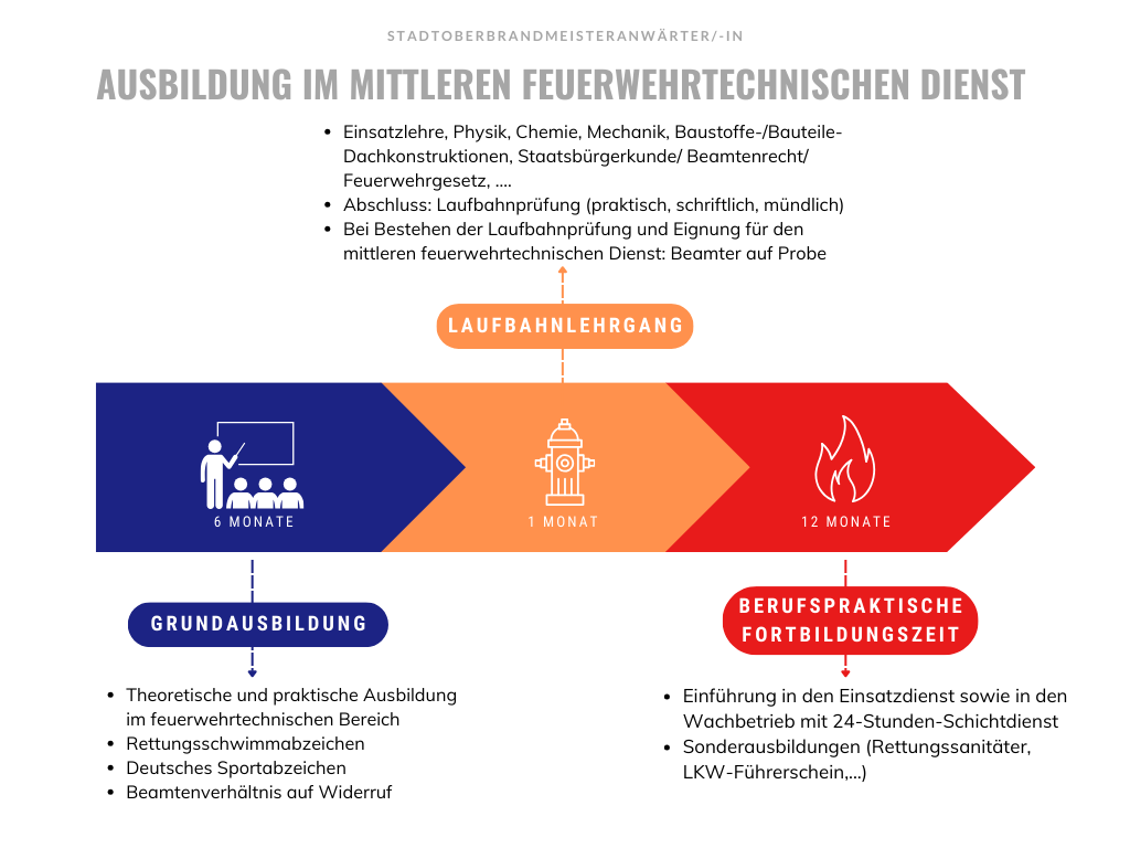 Die Branddirektion Stuttgart bildet jährlich Stadtoberbrandmeister/-innen für den mittleren feuerwehrtechnischen Dienst aus. Diese Laufbahnausbildung bietet einen abwechslungsreichen Beruf, der Schwindelfreiheit, logisches Denken, körperliche Fitness und Teamgeist erfordert.