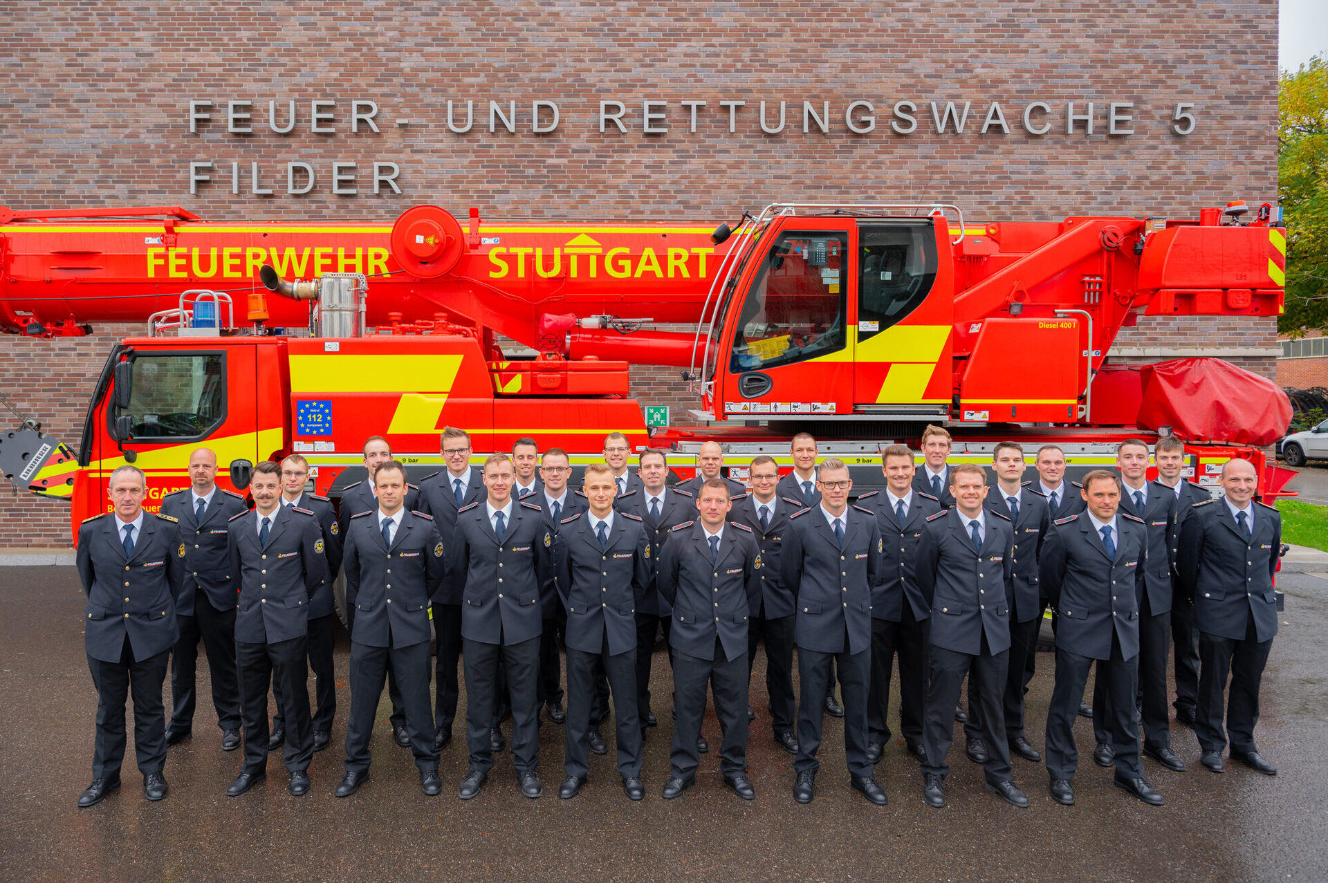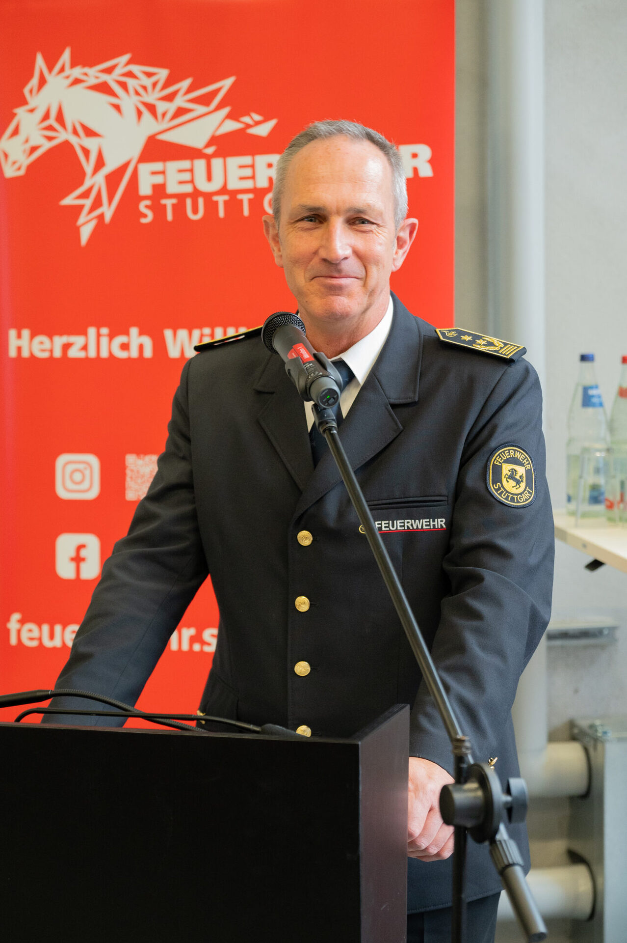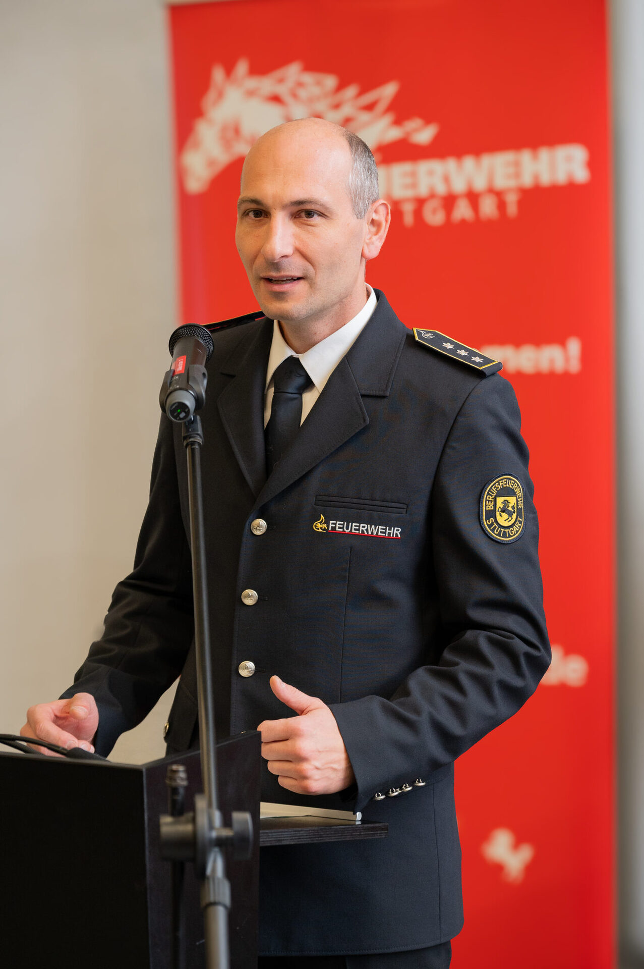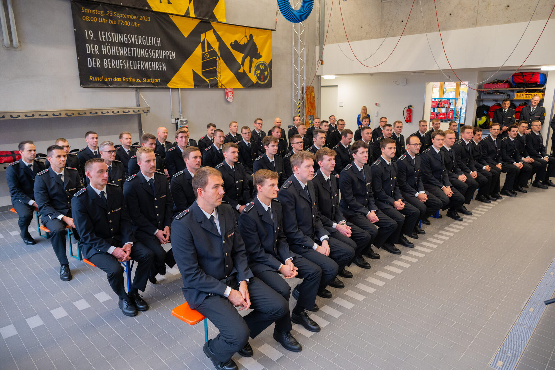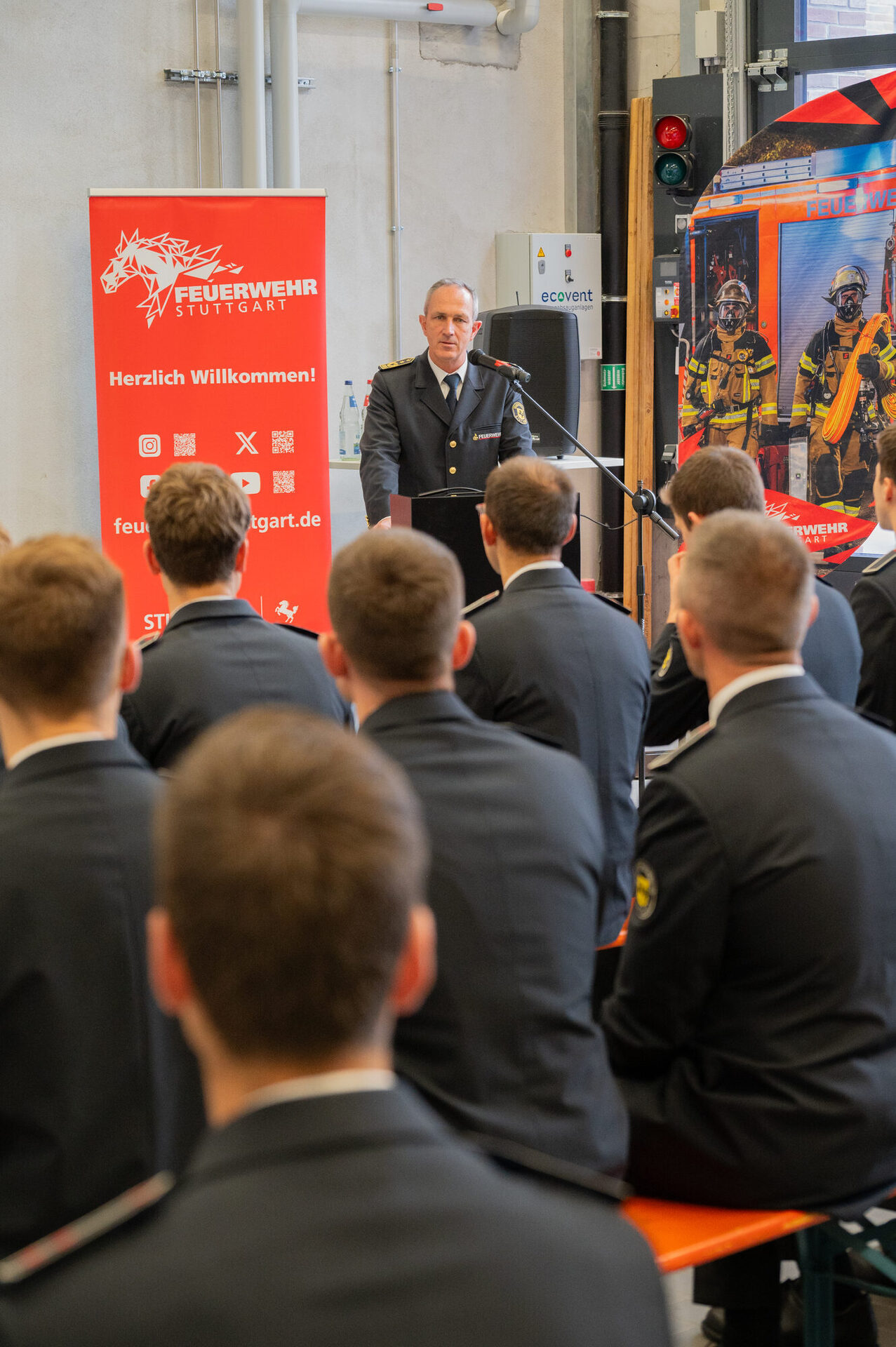 Den feierlichen Rahmen bildete die Fahrzeughalle der neuen Feuer‐ und Rettungswache 5 auf den Fildern. Die Veranstaltung wurde durch Ansprachen des Amtsleiters Dr. Belge und dem Personalratsvorsitzenden Fabian Trillinger umrahmt.