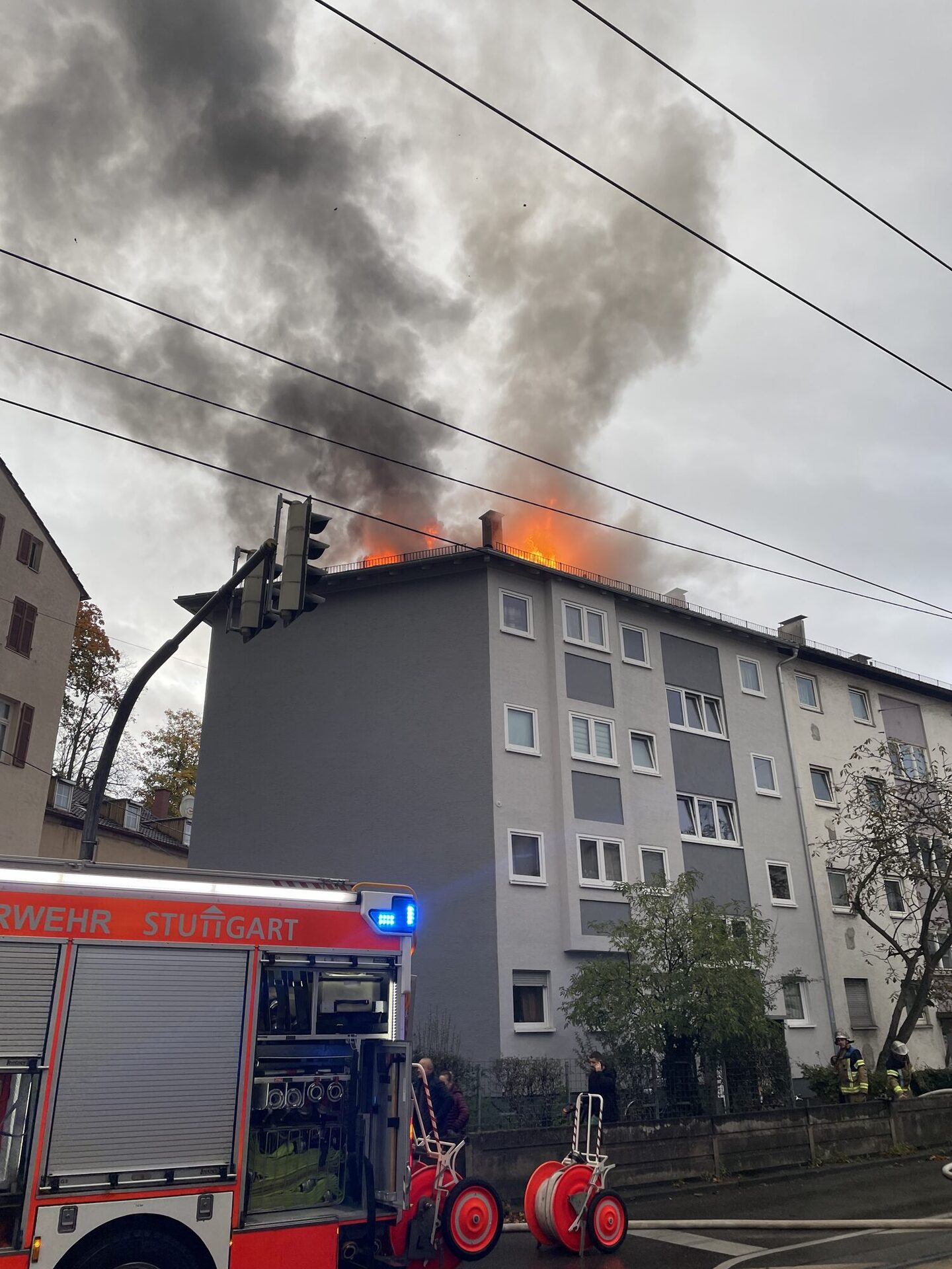 Bei Eintreffen der Feuerwehr fünf Minuten nach Alarmierung, stand der Dachstuhl bereits in Vollbrand und die Flammen drohten auf ein weiteres Wohngebäude überzugreifen. Die Bewohnerinnen und Bewohner des Brandgebäudes hatten ihre Wohnungen bereits bei Eintreffen der Feuerwehr verlassen und blieben unverletzt.
