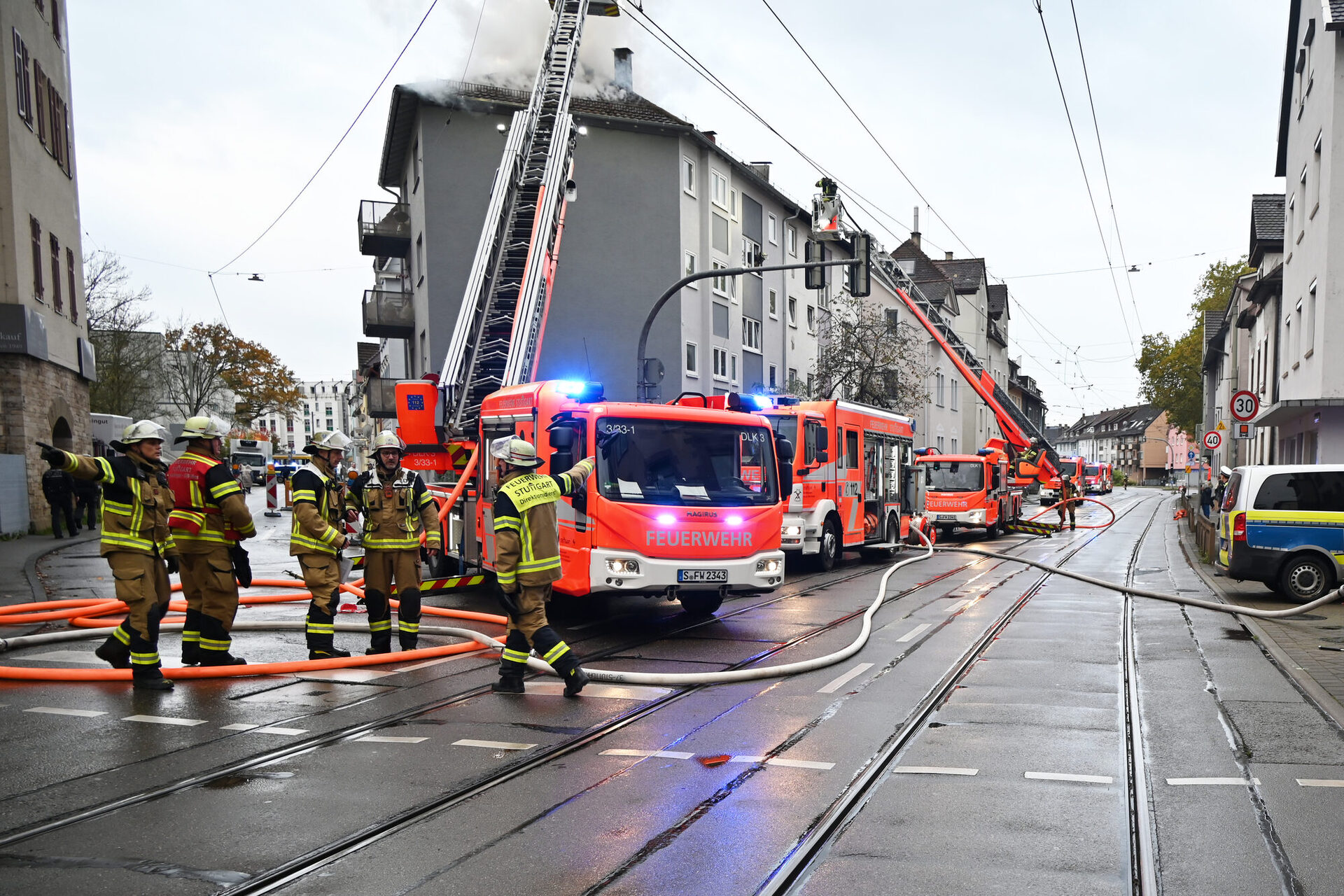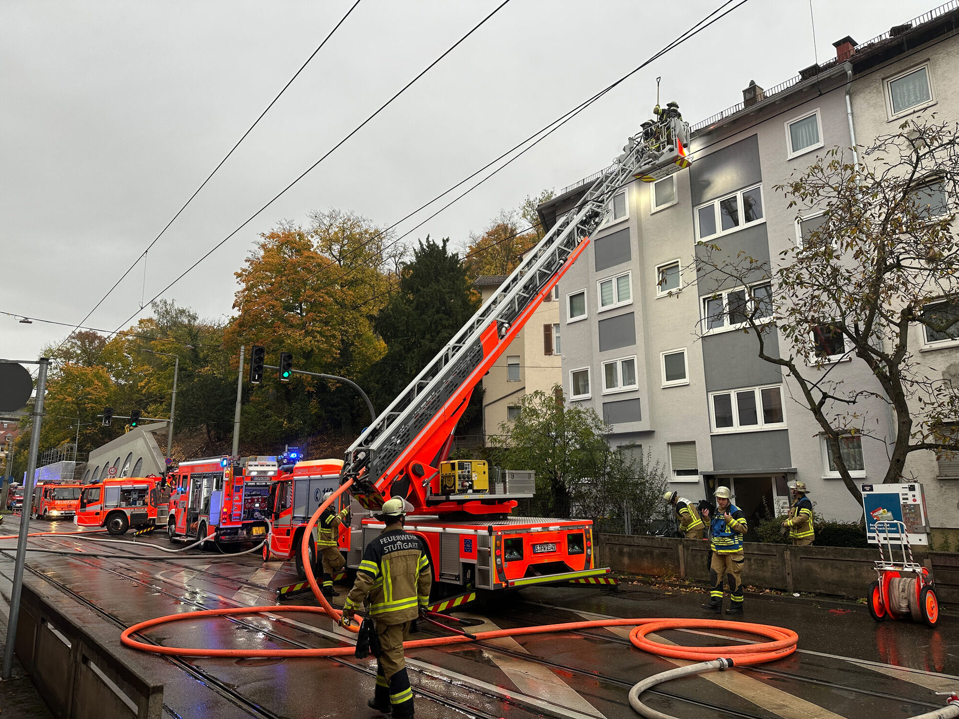 Während den Löscharbeiten musste die Schmidener Straße, ebenso wie die dort verlaufenen Stadtbahnlinien voll gesperrt werden und es kam zu entsprechenden Verkehrsbehinderungen.
