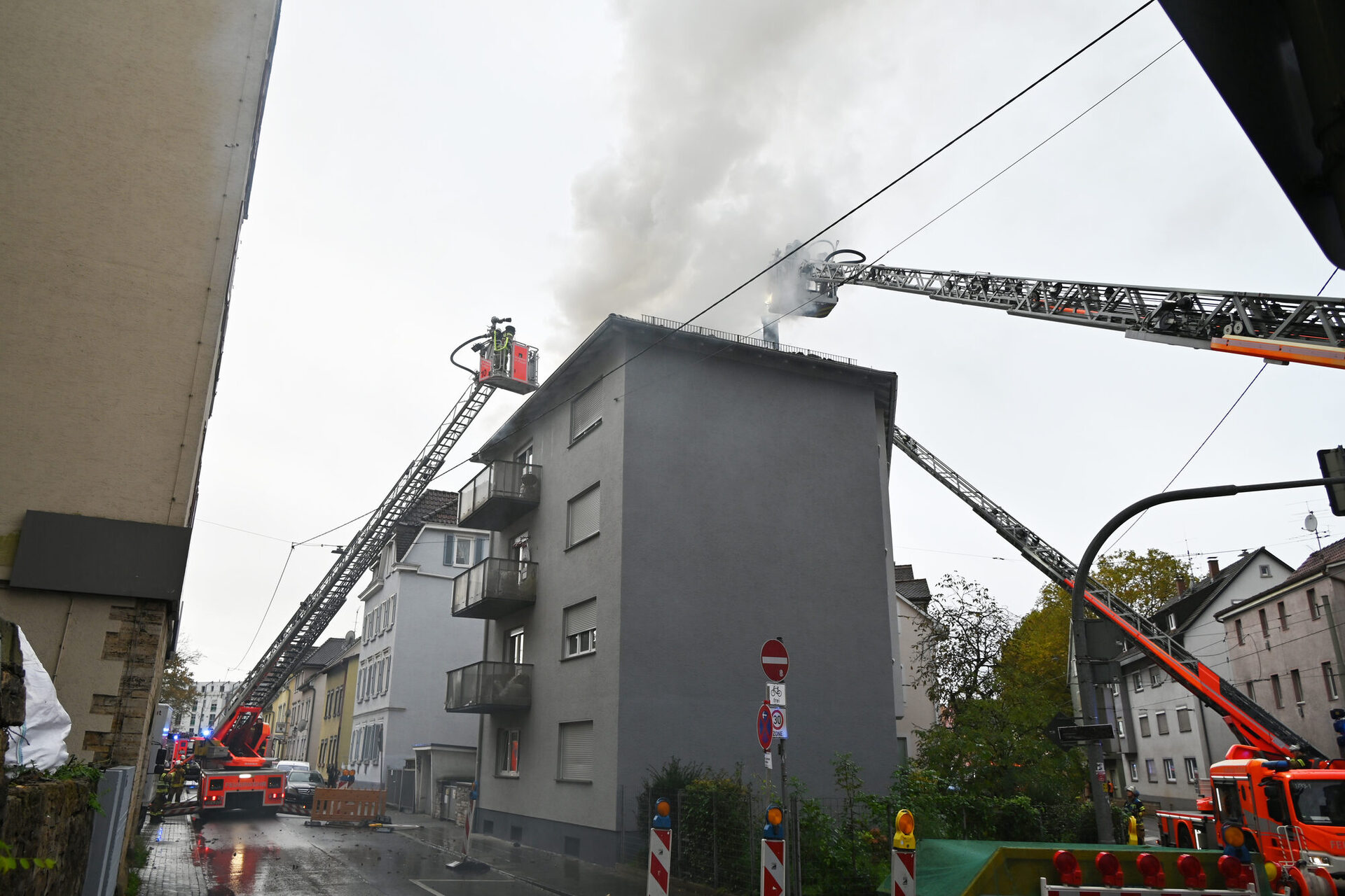 Durch den Einsatz von drei Drehleitern und rund 100 Einsatzkräften konnte ein Brandüberschlag auf das Nachbargebäude in letzter Minute verhindert und der Brand unter Kontrolle gebracht werden. Aufgrund der starken Rauchentwicklung musste das Nachbargebäude ebenfalls geräumt werden. In einem weiteren Gebäude löste durch eingedrungenen Brandrauch die Brandmeldeanlage aus. Ein weiterer Löschzug der Berufsfeuerwehr überprüfte diese Einsatzstelle und arbeitete sie ab.