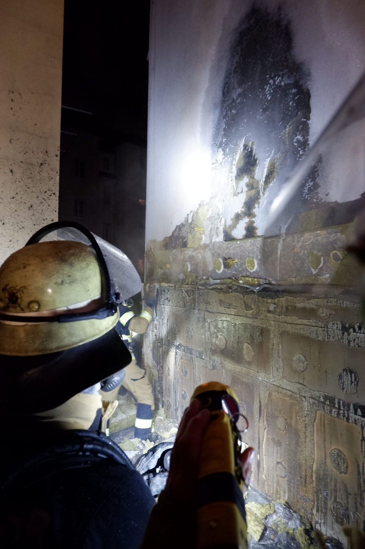 Die Nachlöscharbeiten an den Fassaden gestalteten sich hingegen aufwendiger. Auf der Suche nach Glutnestern, mussten die betroffenen Bereiche auch in größerer Höhe geöffnet werden, sodass der Einsatz einer Drehleiter erforderlich war. Die Einsatzmaßnahmen der Feuerwehr konnten gegen 22:15 Uhr beendet werden.